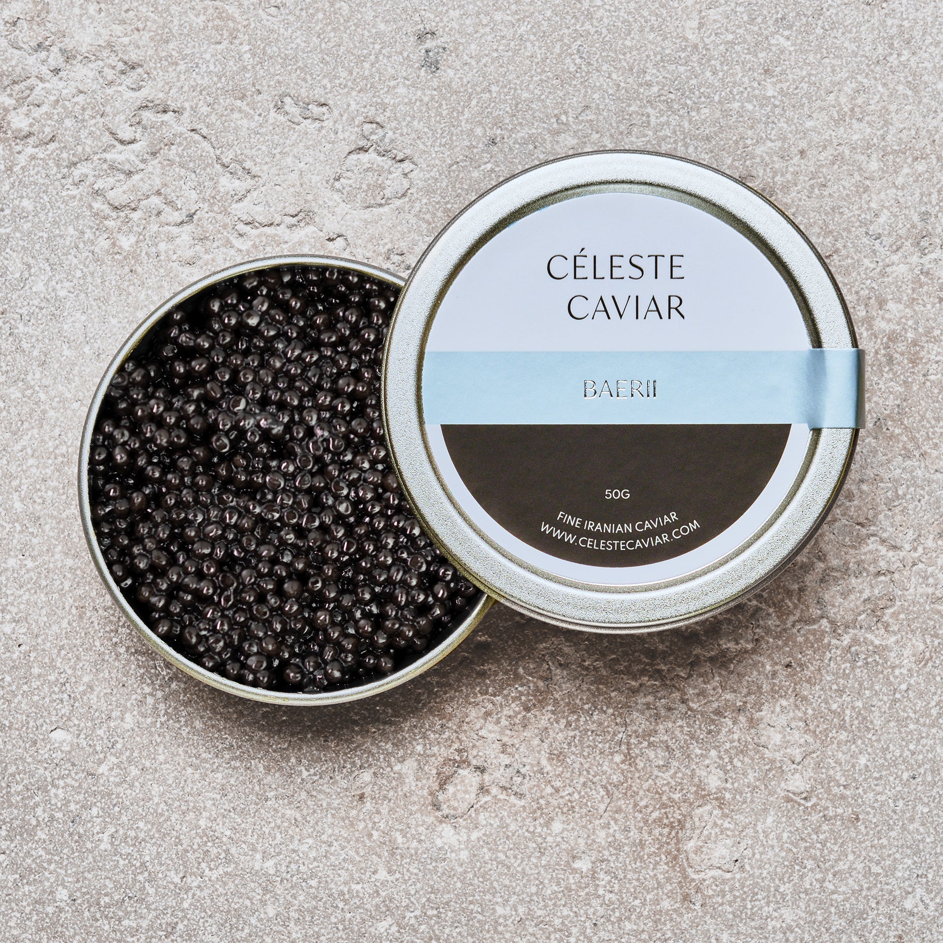 Our Baerii caviar cultivated in Iran and is a fine grain, it is smaller and darker than most caviar. Its colour ranges from classic smoky grey to black with a refined brown hue. The flavour palate of this caviar is nutty with a buttery after-taste. Its smooth creamy, butter-like consistency melts in the mouth. It is a popular and affordable alternative caviar to the Beluga.